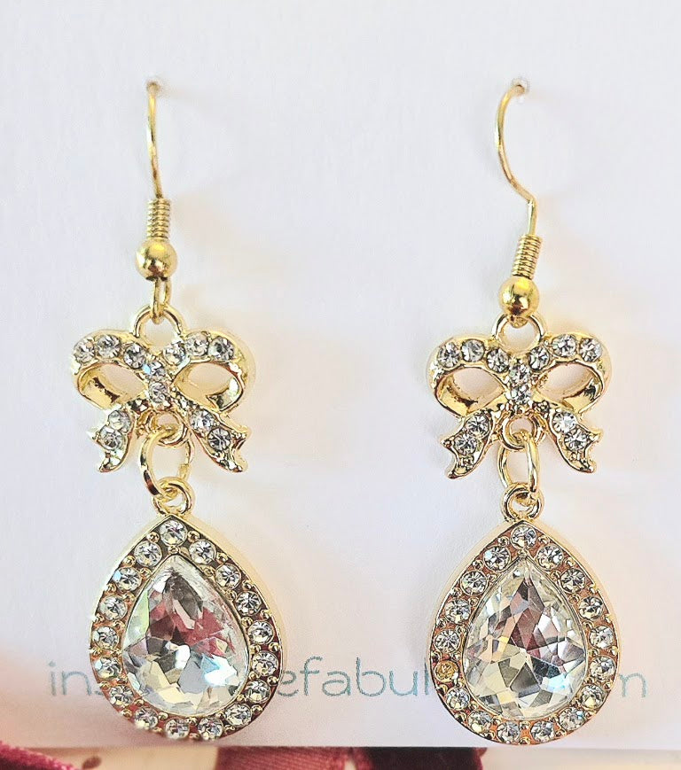 Featuring a crystal teardrop framed in shimmering rhinestones and crowned with a sparkling bow, these earrings are pure sophistication.