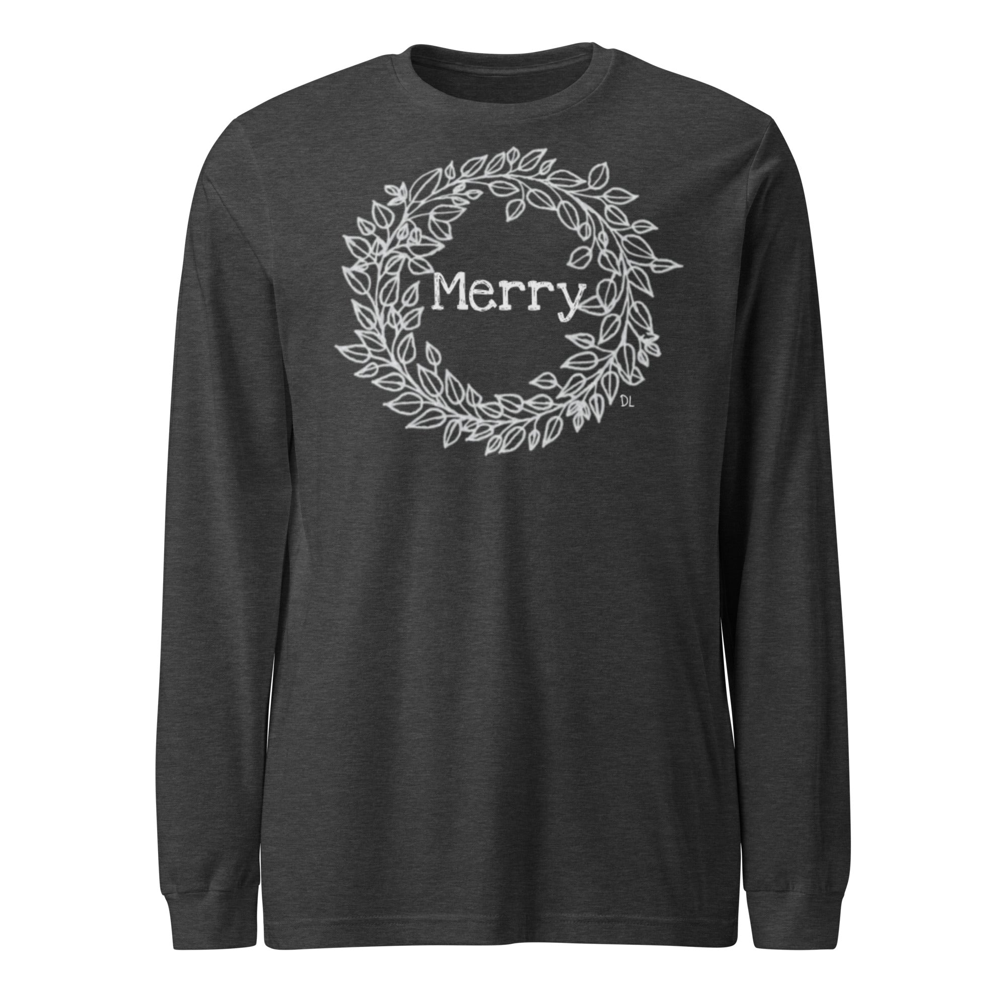 Christmas Wreath Merry Gray lettering Long-Sleeve Tee