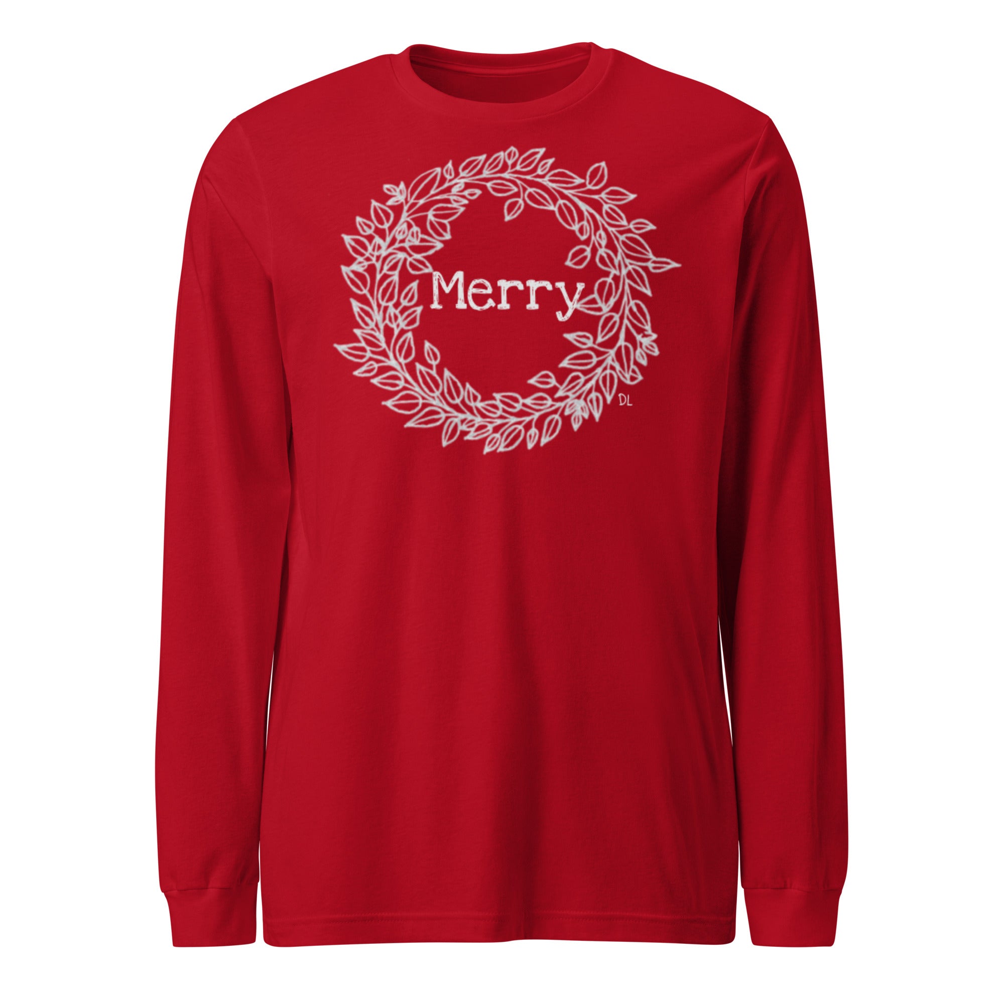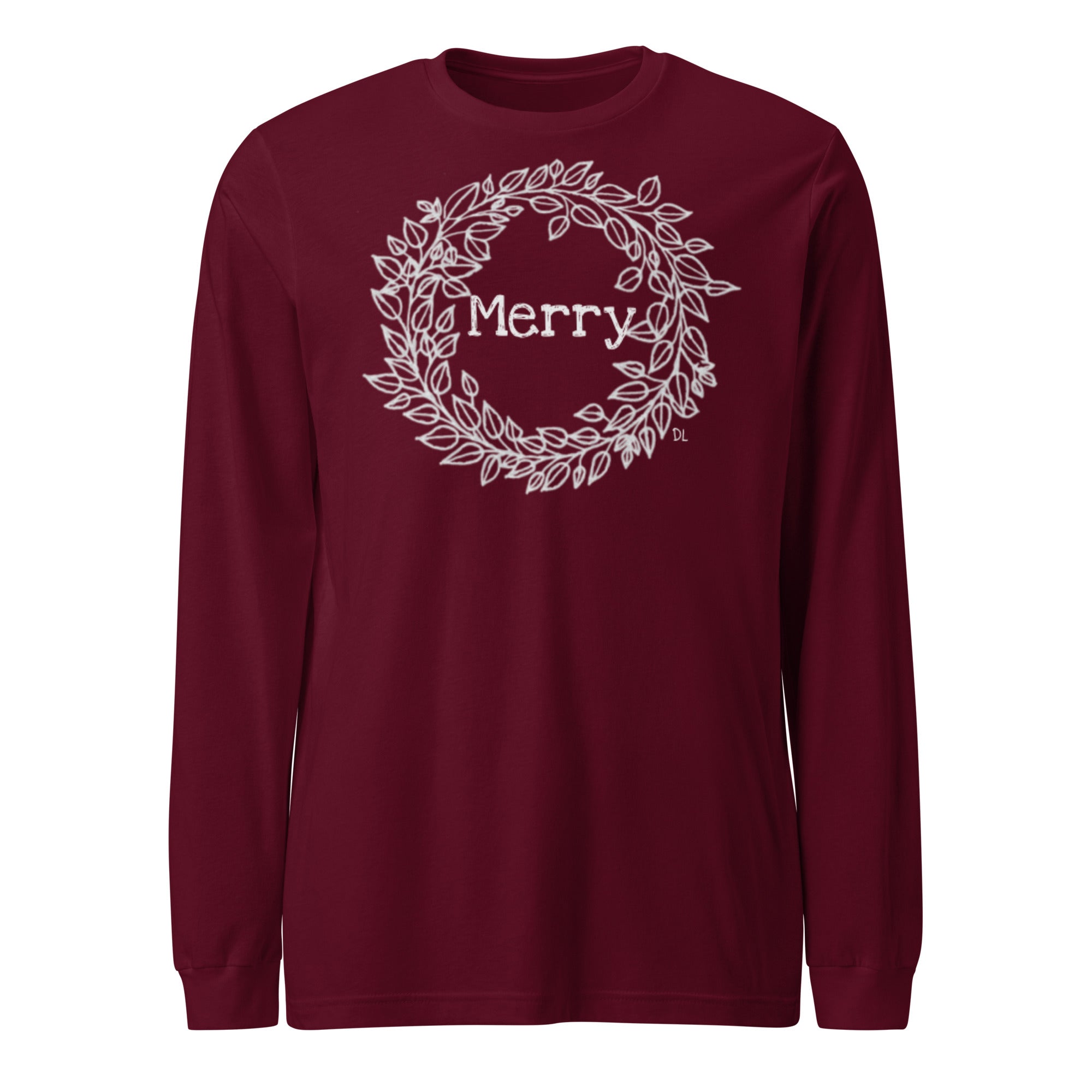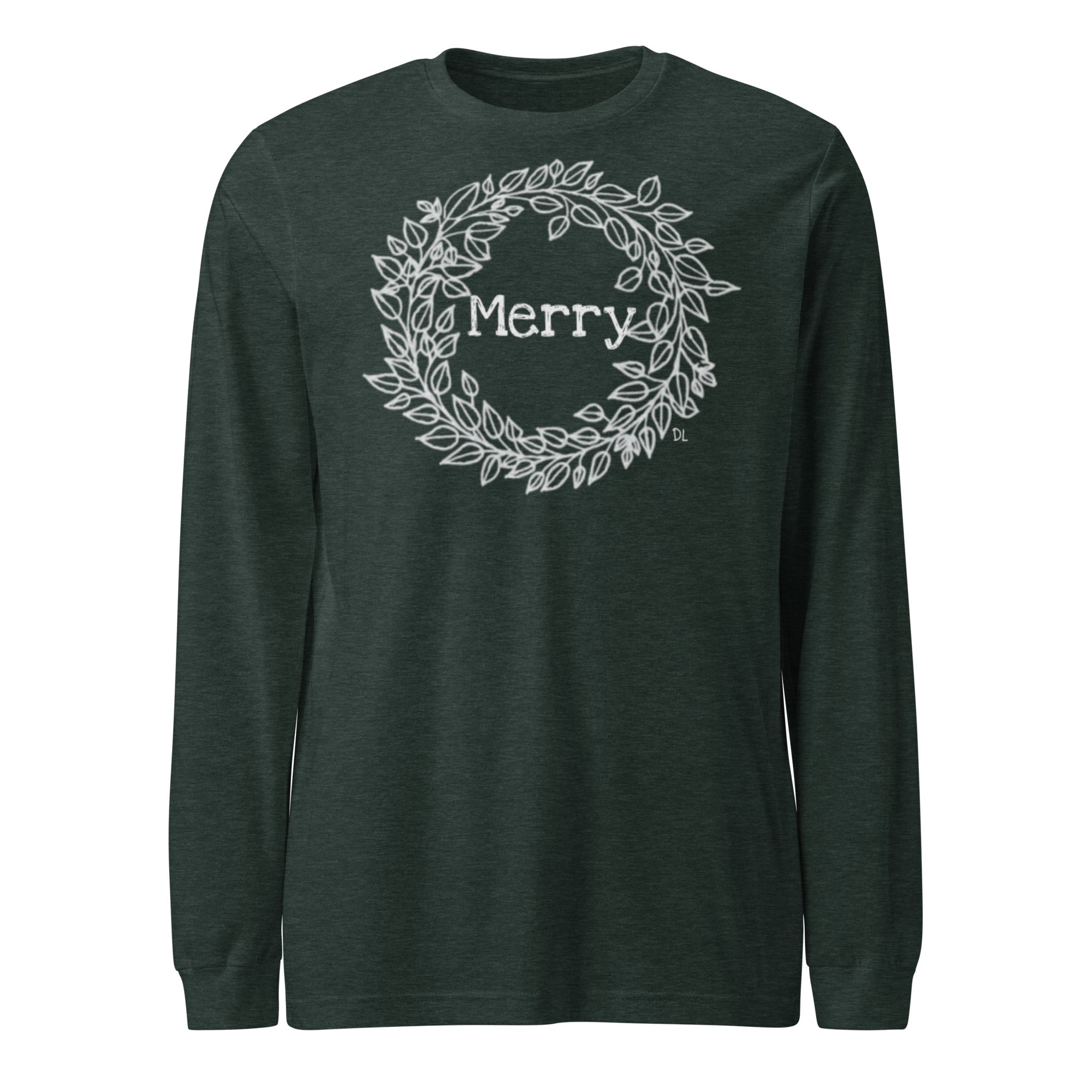 A hand-drawn wreath encircles the word "Merry," making this design a versatile option you'll wear on repeat.