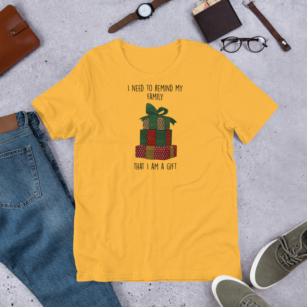 This witty tee features a festive stack of Christmas presents with the playful message: "I need to remind my family that I am a gift."
