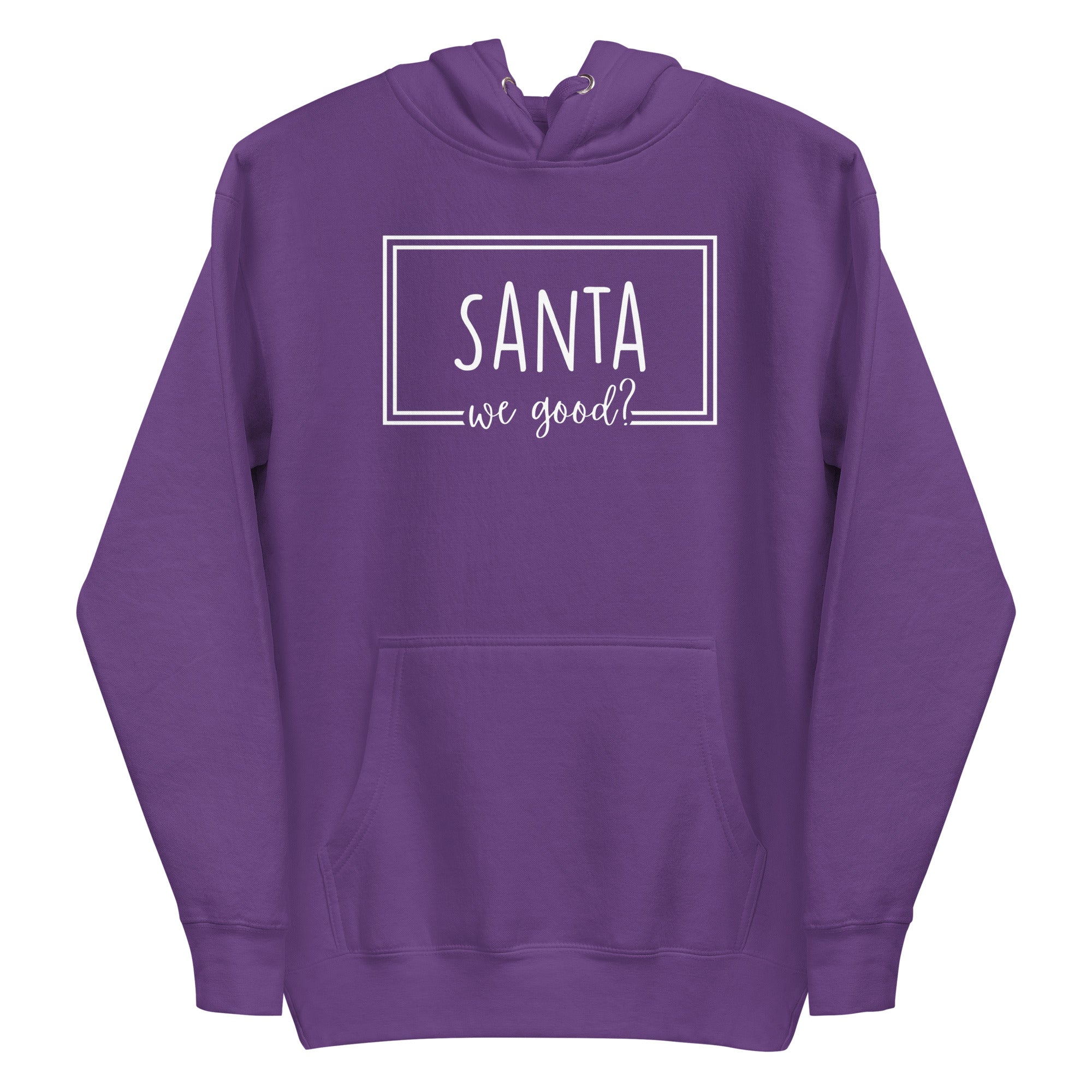 Playful and cheeky, this design asks the question on everyone's mind: "Santa, we good?"