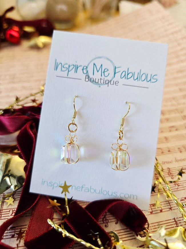 The Tiny Treasures Earrings shimmer with faceted crystal "gift boxes" wrapped in golden wire bows — a sweet little touch of holiday joy for any occasion.